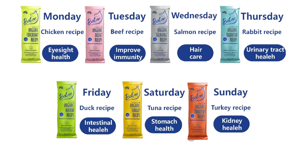 غذای هفتگی سگ (گوشت گاو ، ماهی سالمون ، خرگوش ، مرغ ، اردک ، ماهی تن ، بوقلمون) پک کامل